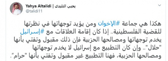 وقال في تغريدة عبر "تويتر" رصدها "المشهد العربي": "هكذا هي جماعة الإخوان ومن يؤيد توجهاتها في نظرتها للقضية الفلسطينية.. إذا كان إقامة العلاقات مع إسرائيل يخدم توجهاتها ومصالحها الحزبية فإن ذلك مقبول وتفتي بأنها حلال.. وإن كان التطبيع مع إسرائيل لا يخدم توجهاتها ومصالحها الحزبية، فهنا التطبيع غير مقبول وتفتي بأنها حرام".