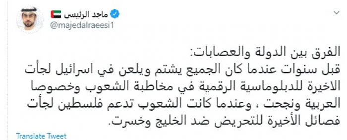 وقال في تغريدة عبر "تويتر" رصدها "المشهد العربي": "الفرق بين الدولة والعصابات: قبل سنوات عندما كان الجميع يشتم ويلعن في إسرائيل لجأت الأخيرة للدبلوماسية الرقمية في مخاطبة الشعوب وخصوصا العربية ونجحت، وعندما كانت الشعوب تدعم فلسطين لجأت فصائل الأخيرة للتحريض ضد الخليج وخسرت".