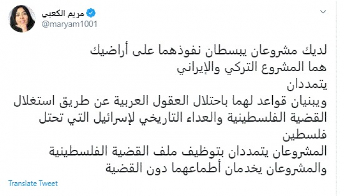 وكتبت في تغريدة عبر "تويتر" رصدها "المشهد العربي": "لديك مشروعان يبسطان نفوذهما على أراضيك هما المشروع التركي والإيراني يتمددان ويبنيان قواعد لهما باحتلال العقول العربية عن طريق استغلال القضية الفلسطينية والعداء التاريخي لإسرائيل التي تحتل فلسطين".