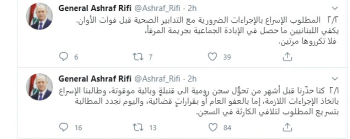 طالب الوزير اللبناني السابق اللواء أشرف ريفي، اليوم، الإسراع باتخاذ الإجراءات الاحترازية في سجن رومية في لبنان قبل تحوله لقنبلة وبائية موقوتة.