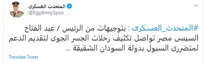 وقال في تغريدة عبر "تويتر" رصدها "المشهد العربي": "المتحدث العسكرى: بتوجيهات من الرئيس/ عبد الفتاح السيسى مصر تواصل تكثيف رحلات الجسر الجوى لتقديم الدعم لمتضررى السيول بدولة السودان الشقيقة".