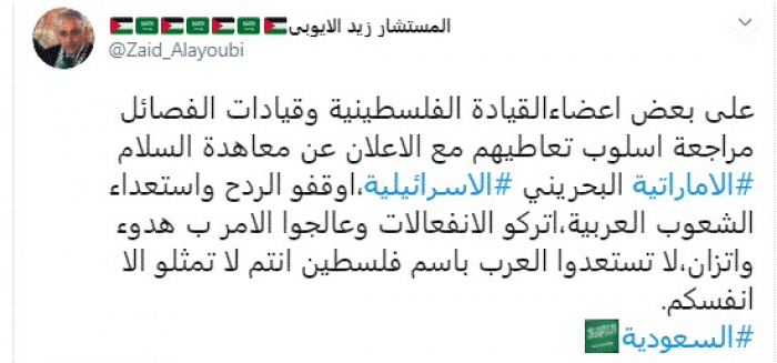 وقال في تغريدة عبر "تويتر" رصدها "المشهد العربي": "على بعض أعضاء القيادة الفلسطينية وقيادات الفصائل مراجعة أسلوب تعاطيهم مع الإعلان عن معاهدة السلام الإماراتية البحرينية الإسرائيلية".