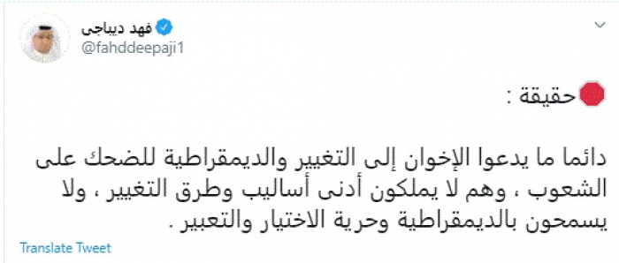انتقد المحلل السياسي السعودي فهد ديباجي، اليوم، جماعة الإخوان، مؤكدًا أنهم لا يملكون أساليب وطرق التغيير الذي ينادون به.