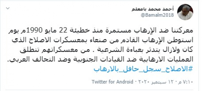 وكتب "بامعلم" تغريدة عبر تويتر، رصدها "المشهد العربي": "معركتنا ضد الاٍرهاب مستمرة منذ خطيئة 22 مايو 1990م يوم استوطن الاٍرهاب القادم من صنعاء بمعسكرات الإصلاح الذي كان ولازال يتدثر بعباءة الشرعية" .