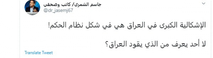 وقال في تغريدة عبر "تويتر" رصدها "المشهد العربي": "الإشكالية الكبرى في العراق هي في شكل نظام الحكم! لا أحد يعرف من الذي يقود العراق؟".