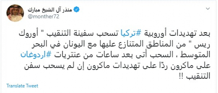 علق المدون السعودي البارز منذر آل الشيخ مبارك، اليوم، على سحب تركيا لسفينة التنقيب "أوروك ريس" من المناطق المتنازع عليها مع اليونان.