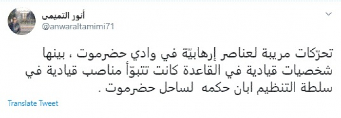 وقال في تغريدة عبر "تويتر" رصدها "المشهد العربي": "تحرّكات مريبة لعناصر إرهابيّة في وادي حضرموت، بينها شخصيات قيادية في القاعدة كانت تتبوّأ مناصب قيادية في سلطة التنظيم إبان حكمه لساحل حضرموت".