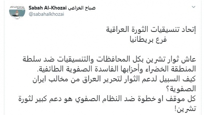 وقال في تغريدة عبر "تويتر" رصدها "المشهد العربي": "اتحاد تنسيقيات الثورة العراقية فرع بريطانيا عاش ثوار تشرين بكل المحافظات والتنسيقيات ضد سلطة المنطقة الخضراء وأحزابها الفاسدة الصفوية الطائفية".