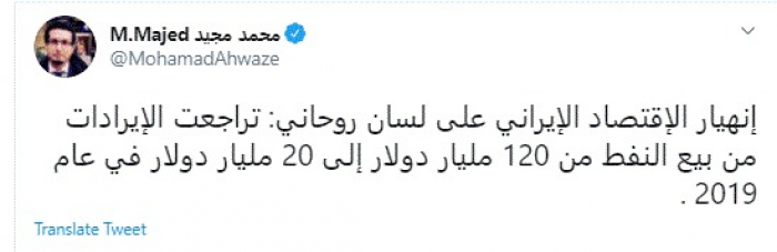 وكتب في تغريدة عبر "تويتر" رصدها "المشهد العربي": "انهيار الإقتصاد الإيراني على لسان روحاني: تراجعت الإيرادات من بيع النفط من 120 مليار دولار إلى 20 مليار دولار في عام 2019".