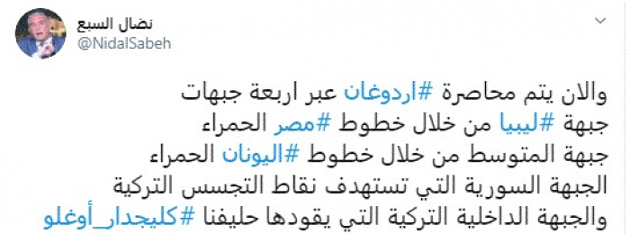 وكتب في تغريدة عبر "تويتر" رصدها "المشهد العربي": "والآن يتم محاصرة أردوغان عبر أربعة جبهات جبهة ليبيا من خلال خطوط مصر الحمراء".