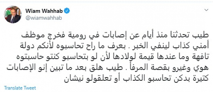وقال في تغريدة عبر "تويتر" رصدها "المشهد العربي": "طيب تحدثنا منذ أيام عن إصابات في رومية فخرج موظف أمني كذاب لينفي الخبر. بعرف ما راح تحاسبوه لأنكم دولة تافهة وما عندها قيمة لولادها لأن لو بتحاسبو كنتو حاسبتوه هوي وغيرو بقصة المرفأ . طيب هلق بعد ما تبين إنو الإصابات كتيرة بدكن تحاسبو الكذاب أو تعلقولو نيشان".
