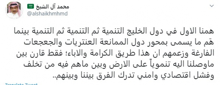 وقال في تغريدة عبر "تويتر" رصدها "المشهد العربي": "همنا الأول في دول الخليج التنمية ثم التنمية ثم التنمية بينما هَم ما يسمى بمحور دول الممانعة العنتريات والجعجعات الفارغة وزعمهم أن هذا طريق الكرامة والاباء؛ فقط قارن بين ما وصلنا إليه تنموياً على الأرض وبين ما هم فيه من تخلف وفشل اقتصادي وأمني تدرك الفرق بيننا وبينهم".