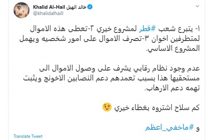وقال في تغريدة عبر "تويتر" رصدها "المشهد العربي": "يتبرع شعب قطر لمشروع خيري.. تعطى هذه الأموال لمتطرفين إخوان.. تصرف الأموال على أمور شخصية ويهمل المشروع الأساسي".