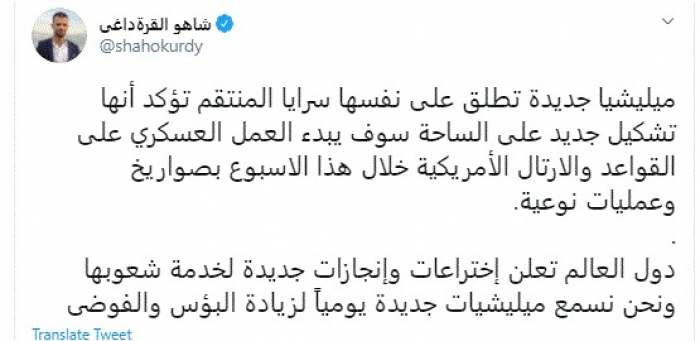 وقال في تغريدة عبر "تويتر" رصدها "المشهد العربي": "مليشيا جديدة تطلق على نفسها سرايا المنتقم تؤكد أنها تشكيل جديد على الساحة سوف يبدء العمل العسكري على القواعد والأرتال الأمريكية خلال هذا الأسبوع بصواريخ وعمليات نوعية.