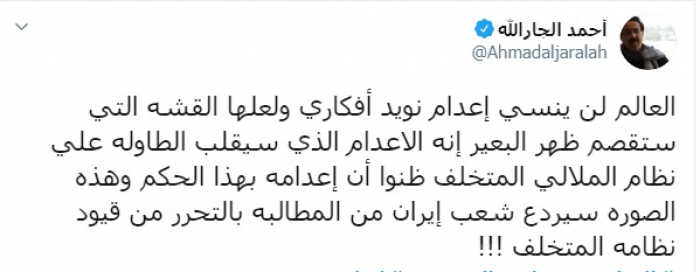 وكتب عبر تغريدة له على "تويتر" رصدها " المشهد العربي": "العالم لن ينسي إعدام نويد أفكاري ولعلها القشة التي ستقصم ظهر البعير، إنه الإعدام الذي سيقلب الطاولة علي نظام الملالي المتخلف، ظنوا أن إعدامه بهذا الحكم وهذه الصورة سيردع شعب إيران من المطالبة بالتحرر من قيود نظامه المتخلف".