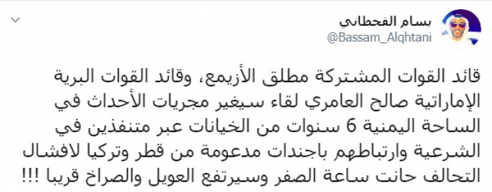 وكتب عبر تغريدة له على "تويتر" رصدها "المشهد العربي": "قائد القوات المشتركة مطلق الأزيمع، وقائد القوات البرية الإماراتية صالح العامري لقاء سيغير مجريات الأحداث في الساحة اليمنية، 6 سنوات من الخيانات عبر متنفذين في الشرعية وارتباطهم بأجندات مدعومة من قطر وتركيا لإفشال التحالف حانت ساعة الصفر وسيرتفع العويل والصراخ قريبا".