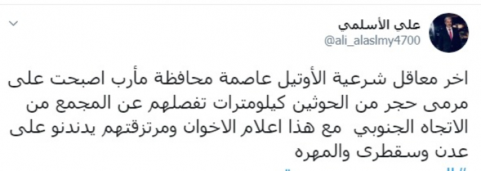 وكتب عبر تغريدة له على "تويتر" رصدها "المشهد العربي": "آخر معاقل شرعية الأوتيل عاصمة محافظة مأرب أصبحت على مرمى حجر من الحوثيين كيلومترات تفصلهم عن المجمع من الاتجاه الجنوبي مع هذا إعلام الإخوان ومرتزقتهم يدندنون على عدن وسقطرى والمهرة".