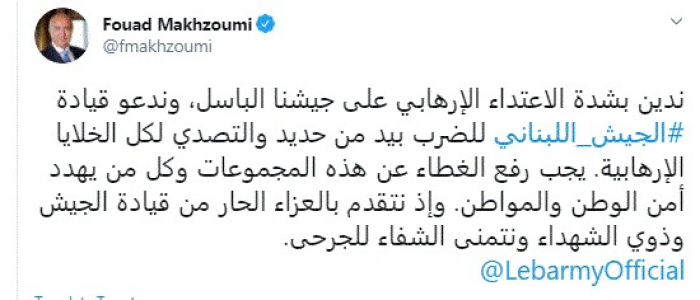 وقال في تغريدة عبر "تويتر" رصدها "المشهد العربي": "ندين بشدة الاعتداء الإرهابي على جيشنا الباسل، وندعو قيادة الجيش اللبناني للضرب بيد من حديد والتصدي لكل الخلايا الإرهابية. يجب رفع الغطاء عن هذه المجموعات وكل من يهدد أمن الوطن والمواطن. وإذ نتقدم بالعزاء الحار من قيادة الجيش وذوي الشهداء ونتمنى الشفاء للجرحى".