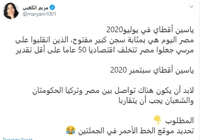 علقت الكاتبة والإعلامية الإماراتية مريم الكعبي، اليوم، على تصريحات ياسين أقطاي المتحدث باسم الرئيس التركي رجب طيب أردوغان والتي طالب فيها بضرورة وجود تقارب بين تركيا ومصر.