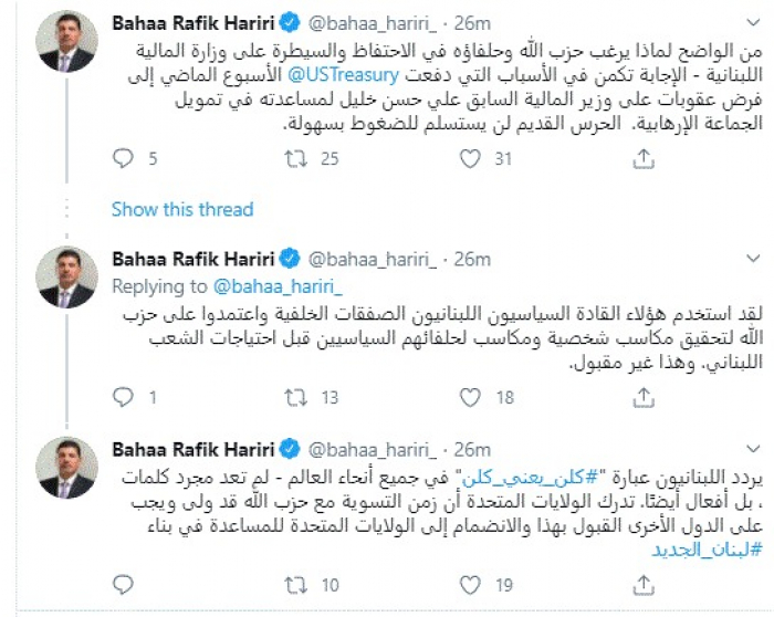 كشف بهاء الدين الحريري نجل رئيس حكومة لبنان الراحل رفيق الحريري، اليوم، سبب رغبة حزب الله وحلفاؤه في السيطرة على وزارة المالية اللبنانية.