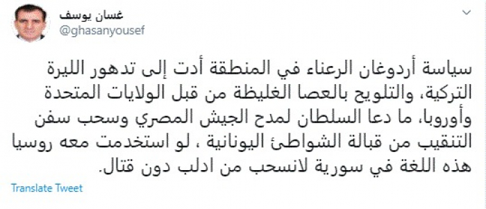 وقال في تغريدة عبر "تويتر" رصدها "المشهد العربي": "سياسة أردوغان الرعناء في المنطقة أدت إلى تدهور الليرة التركية، والتلويح بالعصا الغليظة من قبل الولايات المتحدة وأوروبا، ما دعا السلطان لمدح الجيش المصري وسحب سفن التنقيب من قبالة الشواطئ اليونانية ، لو استخدمت معه روسيا هذه اللغة في سورية لانسحب من ادلب دون قتال".