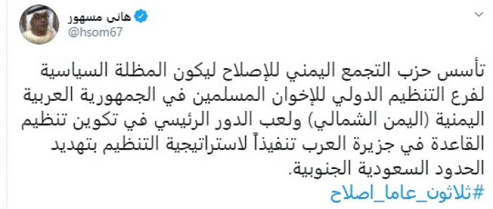 وكتب في تغريدة عبر "تويتر" رصدها "المشهد العربي": "تأسس حزب التجمع اليمني للإصلاح ليكون المظلة السياسية لفرع التنظيم الدولي للإخوان المسلمين في الجمهورية العربية اليمنية (اليمن الشمالي)".