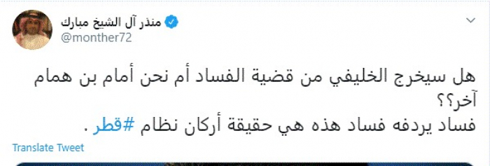 وقال في تغريدة عبر "تويتر" رصدها "المشهد العربي": "هل سيخرج الخليفي من قضية الفساد أم نحن أمام بن همام آخر؟.. فساد يردفه فساد هذه هي حقيقة أركان نظام قطر".