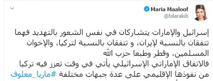 وكتب عبر تغريدة لها على "تويتر" رصدها " المشهد العربي": "إسرائيل والإمارات يتشاركان في نفس الشعور بالتهديد فهما تتفقان بالنسبة لإيران، و تتفقان بالنسبة لتركيا، والإخوان المسلمين، وقطر وطبعا حزب الله، فالاتفاق الإماراتي الإسرائيلي يأتي في وقت تعزز فيه تركيا من نفوذها الإقليمي على عدة جبهات مختلفة".