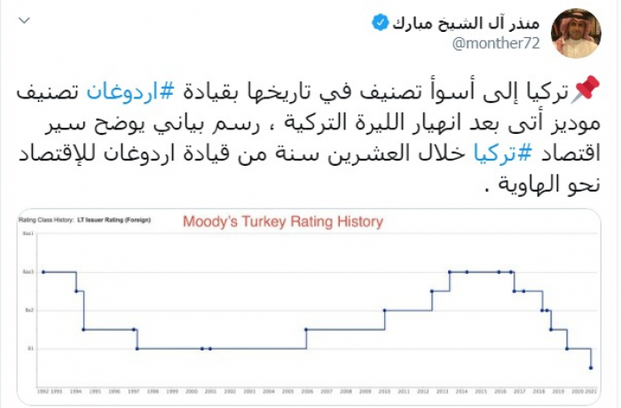 وكتب عبر تغريدة له على "تويتر" رصدها " المشهد العربي": "تركيا إلى أسوأ تصنيف في تاريخها بقيادة أردوغان تصنيف موديز أتى بعد انهيار الليرة التركية، رسم بياني يوضح سير اقتصاد تركيا خلال العشرين سنة من قيادة أردوغان للاقتصاد نحو الهاوية".