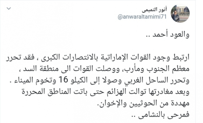 وكتب عبر تغريدة له على "تويتر" رصدها "المشهد العربي": "والعود أحمد، ارتبط وجود القوات الإماراتية بالانتصارات الكبرى ، فقد تحرر معظم الجنوب ومأرب، ووصلت القوات إلى منطقة السد، وتحرر الساحل الغربي وصولا إلى الكيلو 16 وتخوم الميناء، وبعد مغادرتها توالت الهزائم حتى باتت المناطق المحررة مهددة من الحوثيين والإخوان، فمرحى بالنشامى" .