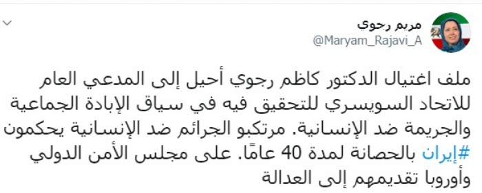 وكتبت عبر تغريدة لها على "تويتر" رصدها " المشهد العربي": "ملف اغتيال الدكتور كاظم رجوي أحیل إلى المدعي العام للاتحاد السويسري للتحقيق فيه في سياق الإبادة الجماعية والجریمة ضد الإنسانية، مرتكبو الجرائم ضد الإنسانية يحكمون إيران بالحصانة لمدة 40 عامًا، على مجلس الأمن الدولي وأوروبا تقديمهم إلى العدالة".