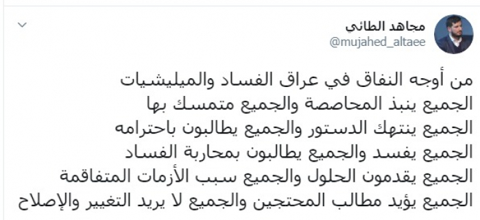 وكتب عبر تغريدة له على "تويتر" رصدها " المشهد العربي": "من أوجه النفاق في عراق الفساد والمليشيات، الجميع ينبذ المحاصصة والجميع متمسك بها، الجميع ينتهك الدستور والجميع يطالبون باحترامه، الجميع يفسد والجميع يطالبون بمحاربة الفساد، الجميع يقدمون الحلول والجميع سبب الأزمات المتفاقمة، الجميع يؤيد مطالب المحتجين والجميع لا يريد التغيير والإصلاح".