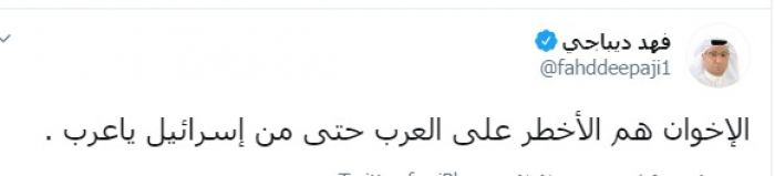 وكتب عبر تغريدة له على "تويتر" رصدها " المشهد العربي": "الإخوان هم الأخطر على العرب حتى من إسرائيل يا عرب".