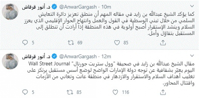 وقال في تغريدات عبر "تويتر" رصدها "المشهد العربي": "مقال الشيخ عبدالله بن زايد في صحيفة وول ستريت جورنال Wall Street Journal اليوم يعبّر بشفافية عن توجه دولة الإمارات الواضح لوضع أسس مستقبل يرتكز على تغليب أهداف السلام والاستقرار والازدهار في منطقة عانت وتعاني من الأزمات واقتتال المحاور".