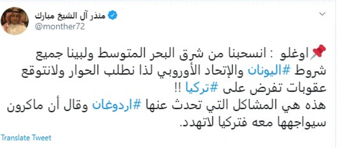 سخر المدون السعودي البارز منذر آل الشيخ مبارك، اليوم، من طلب تركيا للحوار مع اليونان وانسحابها من شرق المتوسط.