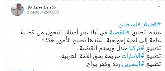 وكتب في تغريدة عبر "تويتر" رصدها "المشهد العربي": "قضية فلسطين.. عندما تصبح القضية في أياد غير أمينة... تتحول من قضية عامة إلى لعبة إخونجية.. عندها تصبح الأمور هكذا: تطبيع تركيا حلال ويخدم القضية.. تطبيع الإمارات جريمة بحق الأمة العربية.. تطبيع البحرين ردة وكفر بواح".