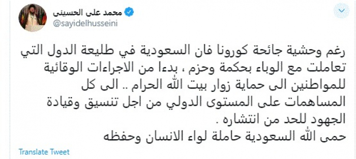 وكتب في تغريدة عبر "تويتر" رصدها "المشهد العربي": "رغم وحشية جائحة كورونا فإن السعودية في طليعة الدول التي تعاملت مع الوباء بحكمة وحزم، بدءًا من الإجراءات الوقائية للمواطنين إلى حماية زوار بيت الله الحرام".