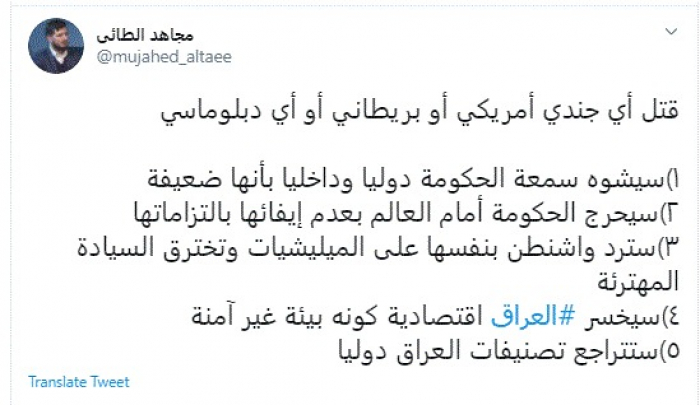 وقال في تغريدة عبر "تويتر" رصدها "المشهد العربي": "قتل أي جندي أمريكي أو بريطاني أو أي دبلوماسي.. سيشوه سمعة الحكومة دوليا وداخليا بأنها ضعيفة.. سيحرج الحكومة أمام العالم بعدم إيفائها بالتزاماتها".
