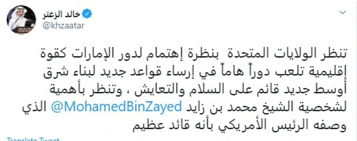 وكتب في تغريدة عبر "تويتر" رصدها "المشهد العربي": "تنظر الولايات المتحدة بنظرة إهتمام لدور الإمارات كقوة إقليمية تلعب دوراً هاماً في إرساء قواعد جديد لبناء شرق أوسط جديد قائم على السلام والتعايش، وتنظر بأهمية لشخصية الشيخ محمد بن زايد الذي وصفه الرئيس الأمريكي بأنه قائد عظيم".