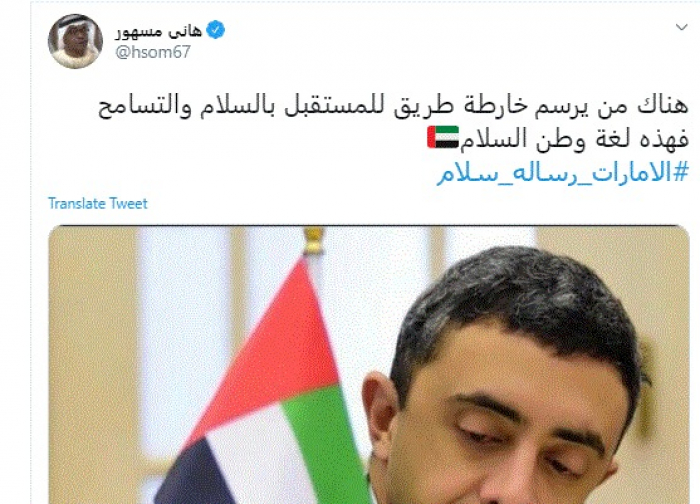 وقال في تغريدة عبر "تويتر" رصدها "المشهد العربي": "هناك من يرسم خارطة طريق للمستقبل بالسلام والتسامح فهذه لغة وطن السلام".