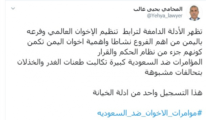 وكتب عبر تغريدة له على "تويتر" رصدها "المشهد العربي": "تظهر الأدلة الدامغة لترابط تنظيم الإخوان العالمي وفرعه باليمن من أهم الفروع نشاطا، وأهمية إخوان اليمن تكمن في كونهم جزءا من نظام الحكم والقرار".