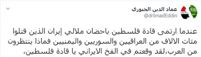 وكتب عبر تغريدة له على "تويتر" رصدها " المشهد العربي": "عندما ارتمى قادة فلسطين بأحضان ملالي إيران الذين قتلوا مئات الآلاف من العراقيين والسوريين واليمنيين فماذا ينتظرون من العرب، لقد وقعتم في الفخ الإيراني يا قادة فلسطين".