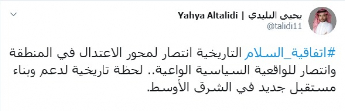وكتب عبر تغريدة له على "تويتر" رصدها " المشهد العربي": "اتفاقية السلام التاريخية انتصار لمحور الاعتدال في المنطقة وانتصار للواقعية السياسية الواعية، لحظة تاريخية لدعم وبناء مستقبل جديد في الشرق الأوسط.