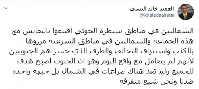 قال الكاتب والمحلل العسكري، العميد خالد النسي، اليوم الثلاثاء، إنه لا توجد صراعات في الشمال بل جبهة موحدة ضد الجنوب.