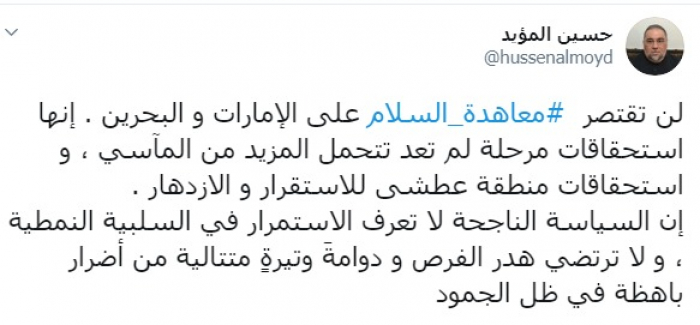 وكتب عبر تغريدة له على "تويتر" رصدها " المشهد العربي": "لن تقتصر معاهدة السلام على الإمارات و البحرين، إنها استحقاقات مرحلة لم تعد تتحمل المزيد من المآسي، واستحقاقات منطقة عطشى للاستقرار و الازدهار" .