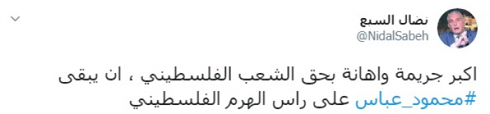 وكتب عبر تغريدة له على "تويتر" رصدها " المشهد العربي":" أكبر جريمة وإهانة بحق الشعب الفلسطيني، أن يبقى محمود عباس على رأس الهرم الفلسطيني".