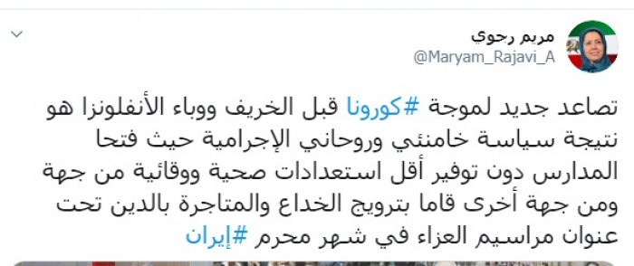 وكتبت عبر تغريدة لها على "تويتر" رصدها " المشهد العربي": "تصاعد جديد لموجة كورونا قبل الخريف ووباء الأنفلونزا هو نتيجة سياسة خامنئي وروحاني الإجرامية حيث فتحا المدارس دون توفير أقل استعدادات صحية ووقائية من جهة ومن جهة أخرى قاما بترويج الخداع والمتاجرة بالدين تحت عنوان مراسيم العزاء في شهر محرم".