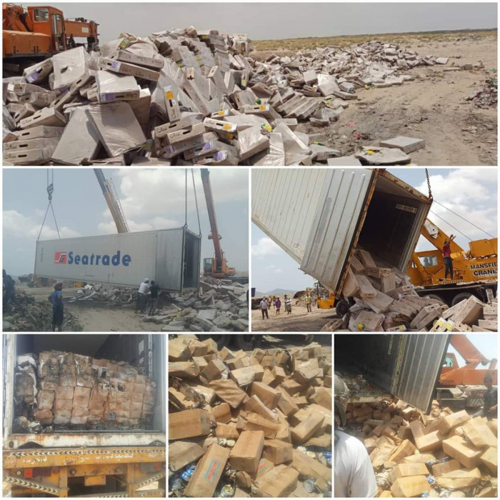 أتلف مكتب هيئة المواصفات والمقاييس، في منفذ الحاويات بجمرك المنطقة الحرة في العاصمة عدن، يوم الثلاثاء، كميات كبيرة من منتج دجاج مجمد مستورد.