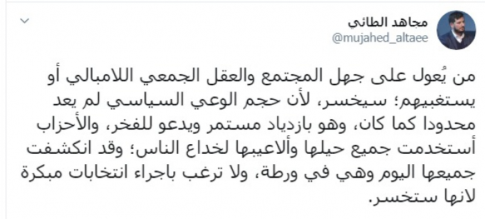 وكتب عبر تغريدة له على "تويتر" رصدها " المشهد العربي": "من يُعول على جهل المجتمع والعقل الجمعي اللامبالي أو يستغبيهم؛ سيخسر، لأن حجم الوعي السياسي لم يعد محدودا كما كان، وهو بازدياد مستمر ويدعو للفخر، والأحزاب استخدمت جميع حيلها وألاعيبها لخداع الناس؛ وقد انكشفت جميعها اليوم وهي في ورطة، ولا ترغب بإجراء انتخابات مبكرة لأنها ستخسر".