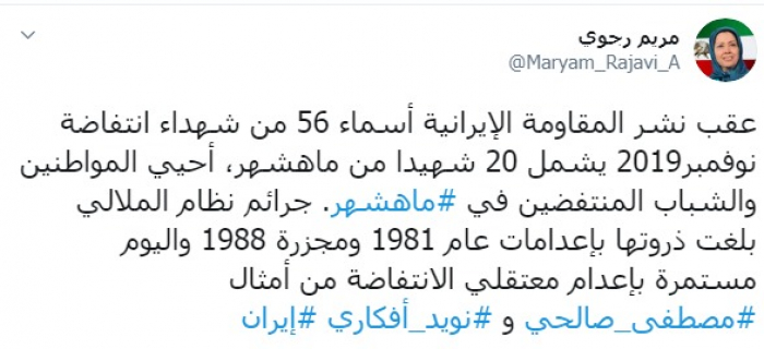 وكتبت عبر تغريدة لها على "تويتر" رصدها " المشهد العربي": "عقب نشر المقاومة الإيرانية أسماء 56 من شهداء انتفاضة نوفمبر2019 يشمل 20 شهيدا من ماهشهر، أحيي المواطنين والشباب المنتفضين في ماهشهر، جرائم نظام الملالي بلغت ذروتها بإعدامات عام 1981 ومجزرة 1988 واليوم مستمرة بإعدام معتقلي الانتفاضة من أمثال مصطفى صالحي و ونويد أفكاري".